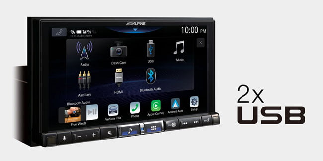 Alpine iLX-705D ei sisällä CD-/DVD-koneistoa, mutta kahden USB-liitännän ansiosta saat esimerkiksi toisen liittimen kautta ladattua puhelintasi ja toisessa liittimessä voi olla USB-tikku tai kiintolevy, jolta toistat musiikki ja videotiedostoja.