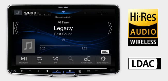 Alpine iLX-F115D täyttää LDAC (Lossless Digital Audio Codec) vaatimukset, joten langaton musiikin striimaus bluetoothilla onnistuu jopa 990kbps nopeudella. Tämän ansiosta saat parhaan mahdollisen äänenlaadun, kun toistat korkealaatuisia musiikkitiedostoja puhelimestasi tai suoratoistopalvelusta. LDAC osaa säätää bittivirtaa toiston aikana, jotta heikoissakaan verkko-olosuhteissa toisto ei katkea.