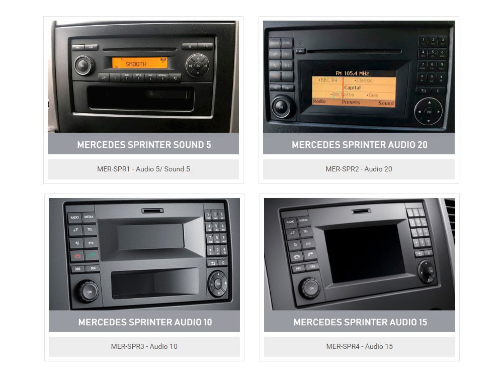 Alpine ILX-F115S906 sopii kaikkiin MB Sprinter ja VW Crafter malleihin, joissa on kuvan mukainen Audio 5, Audio 10, Audio 15 tai Audio 20 -soitin tehdasasennettuna. Asennussarjan mukana tulee ohjeet, mitä adaptereja asennustarvikkeista käytetään auton alkuperäisestä soittimesta riippuen.