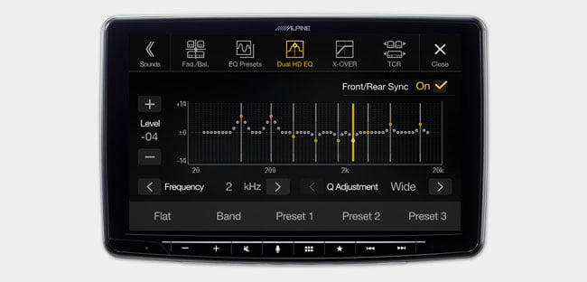 Alpine INE-F904D sisältää Bass Engine SQ:n, joka mahdollistaa äänen täydellisen säätämisen aina aikaviivesäädöistä, jakosuotimista ja 9-alueisesta taajuuskorjaimesta alkaen. Ja mikä hienointa, voit tehdä Android- ja iOS-laitteella säädöt ilmaisen TuneIt -sovelluksen avulla. 4 Voltin linjalähdöt sekä 24bit D/A -muuntimet ja tuki esim. FLAC-tiedoistoille löytyvät, luonnollisest.