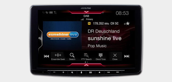 Perinteisen RDS-virittimen lisäksi Alpine INE-F904D sisältää myös digitaalisen DAB-radion, joten voit ulkomailla kuunnella digitaalisia radiokanavia.