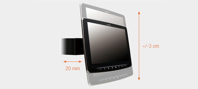 Näytön korkeutta voidaan säätää +/- 3cm keskikohdasta ja näytön syvyyttä voidaan säätää 20mm. Säädön jälkeen näyttö lukitaan tiukasti paikalleen.