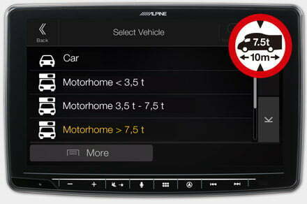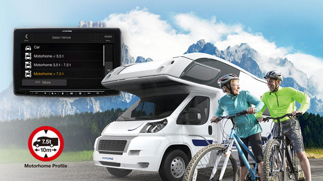 Matkailuauton tyypin voi valita (small, medium, large) tai määrittää ajoneuvon tarkat mitat Alpinen muistiin. Tämän jälkeen navigointi ottaa nämä mitat aina mukaan reittilaskennassa ja huomioi esimerkiksi siltojen paino- ja korkeusrajoitukset ja laskee reitin näitä tietoja hyödyntäen.