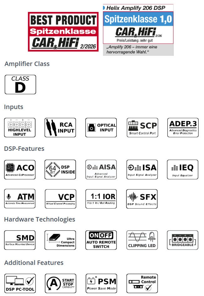 Helix AMPLIFY 206 DSP on yhteensopiva Audiotec Fischerin uuden DSP PC-Tool 6 -version kanssa.