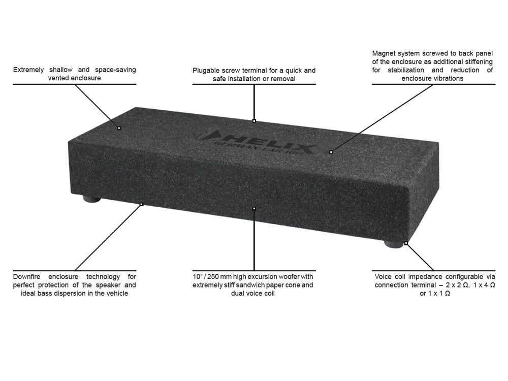 10″ subwoofer on asennettu kotelon pohjaan ja kotelossa on jalat, jotka jättävät subwooferin toiminnan vaatiman raon tavaratilan pohjan ja kotelon pohjan välille. Tämän kotelon sijoittaminen on helppoa, koska subwoofer on suojassa kotelon pohjassa. Elementin suojana on lisäksi tiheä ritilä joka antaa sille täydellisen suojan kaikilta mekaanisilta vaurioilta autosi tavaratilassa.