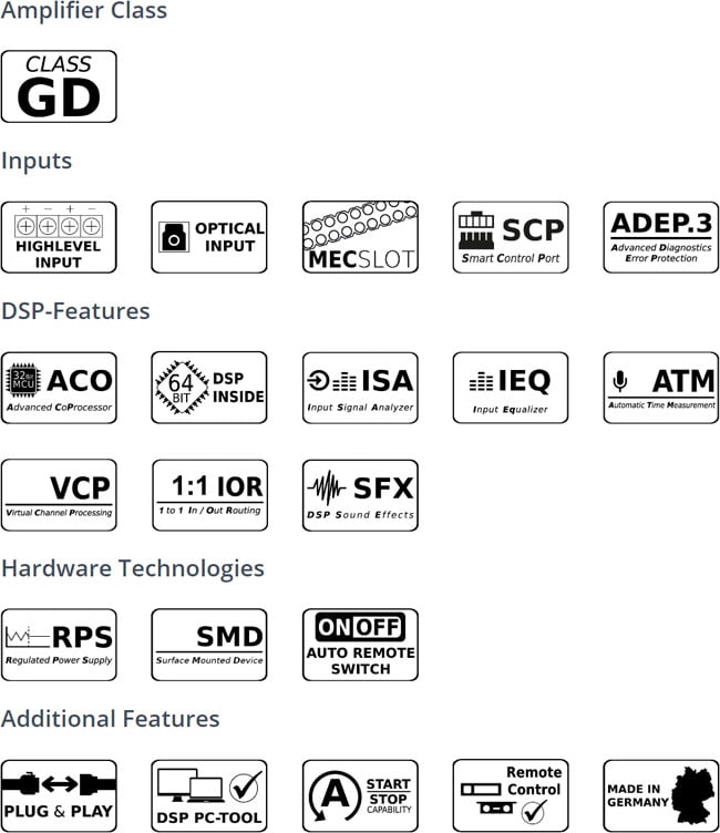 Audiotec Fischerin Class GD-teknologia, 64 bittisen DSP:n mahtava laskentateho sekä uudet innovatiiviset DSP-toiminnot kuten Augmented Bass Processing, StageXpander ja RealCenter takaavat huippuluokan kuunteluelämyksen.